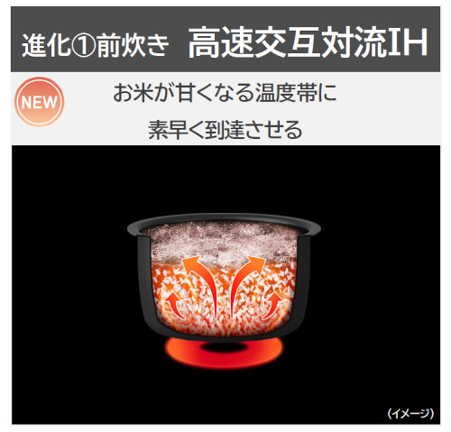 前炊きの熱源は、釜底と釜底側面のIHが高速に切り替わる「高速交互対流IH」。熱源の高速な切り替えにより、釜内で対流を起こして米をおどらせながら熱を伝えていく。
