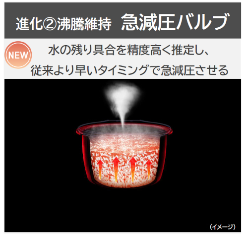 次に米が甘くなるα化(糊化)が進む「沸騰維持」では、「ビストロ匠技 AI」に加えて、可変圧力技術による「急減圧バルブ」が機能する。主に、リアルタイム赤外線センサーとリアルタイム圧力センサーの精度の高い検知により、釜内の水の残り具合が推定できるようになったという。