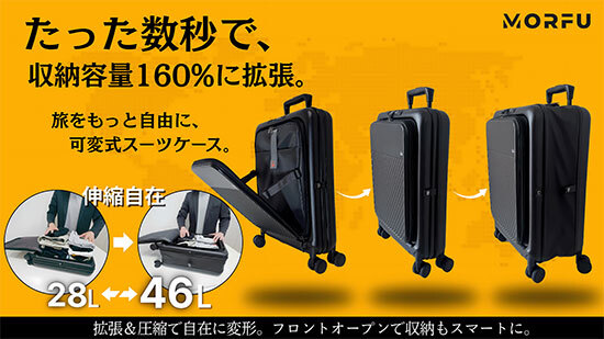 「MORFU」は、旅先や移動中における「ちょっと困る」を解決する多機能スーツケースで、用途や荷物量に応じて容量を自在に調整できる「伸縮ギミック」を備えてる。容量は28Lから最大46Lまでアップさせられるので、旅先などで荷物が増えてしまった場合でもスマートな対応が可能になる。また、容量アップのための変形は簡単で、30秒で変形が完了する。