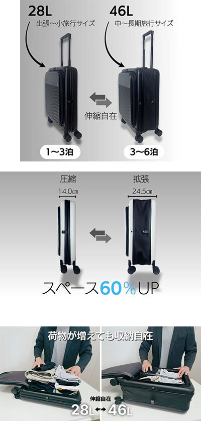 収納容量が28Lから46Lに最大60%アップする「可変式スーツケース」