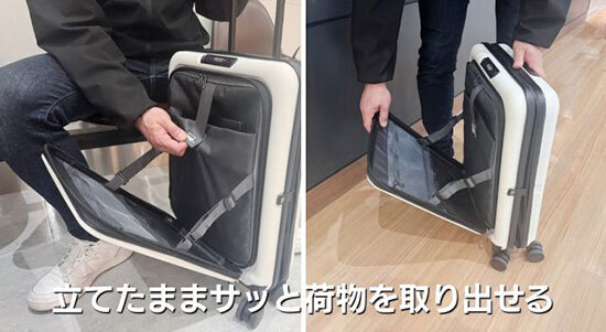 あわせて、収納物を簡単に取り出せるフロントオープン構造を採用し、電車内や空港といった狭い場所でも中身をスムーズに出し入れできる。また、PCポケットも備えているので、ビジネス用途にも適している。