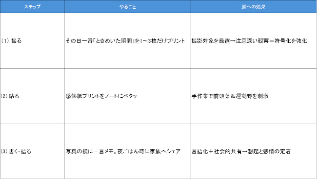 この「スクラップブック療法」をはろぷりに応用してみます。上手くいけば、日常的に脳を鍛えることができます。気になる人は、以下のように、「撮る」→「貼る」→「書く・語る」の3ステップで取り組んでみるのが良いでしょう。