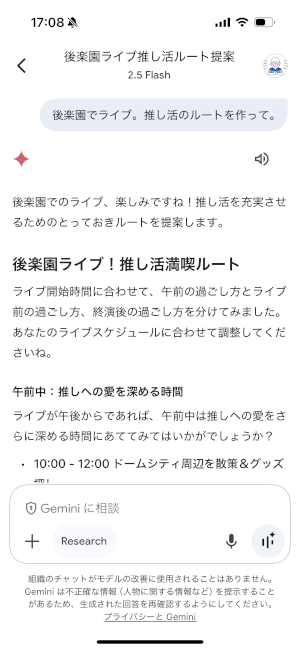 聖地巡礼をする際、以前はさまざまなサイトやSNSから情報を集め、自分でルートやスケジュールを考えなければなりませんでした。しかし、生成AIが登場した現在、そういった準備は全て生成AIが代替してくれます。「Google Gemini」などのAIアシスタントを使えば、インターネットでライブやオンライン配信などの情報を集め、ほかの予定を調整しながら効率よくスケジュールを調整することができます。このように、Googleのサービスと連携することで、効率よく推し活の計画が立てられるようになりました。