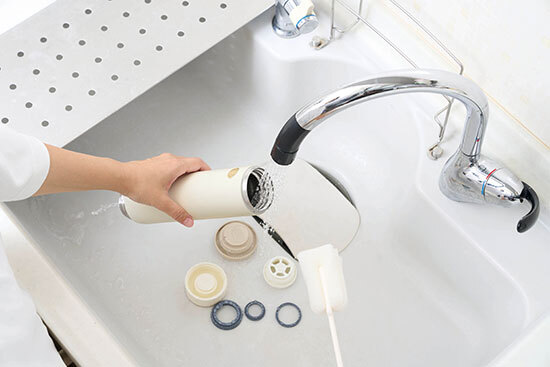 底部があけられるようになったことで通気性が向上し、洗浄後は水切りカゴに立てかけるだけでボトル内部までしっかり乾燥させられる。また、すべてのパーツが分解可能なため細部まで乾かしやすいので、カビが発生しやすい季節の変わり目でも安心して使える。