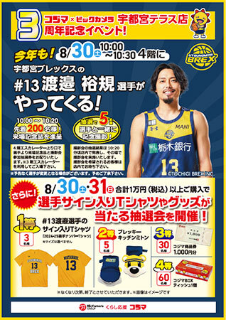 コジマは8月30日に、「コジマ×ビックカメラ宇都宮テラス店」(栃木県宇都宮市)のオープン3周年を記念して、プロバスケットボールチーム「宇都宮ブレックス」の渡邉裕規選手が同店に来店するイベントを開催する。