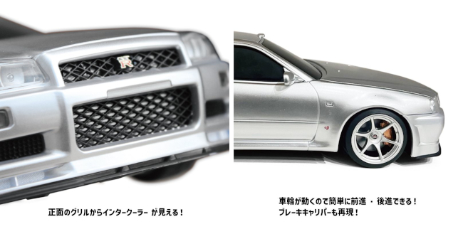 GT-Rのエンブレムが付いたフロントからはグリルの奥にインタークーラーがのぞき、リヤウイングやヘッドライト、フォグランプ、バックランプ、ウインカーランプまで本格的に再現するとともに、ブレーキキャリパーやホイールの造形もこだわった作りとなっており、使わない時でもインテリアとして飾れる。
