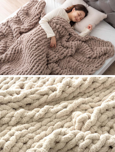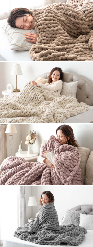 直径25mmの極太糸を使用し、職人が1つひとつ丁寧に手編みで仕上げている。ふんわりとしたシェニール糸を採用しており、肌に触れたときの柔らかさともこもこ感のかわいらしさを両立させた。大きめの編み目がつくる立体感は、ソファやベッドの上に置くだけで部屋のワンポイントとなり、保温性に優れているので秋冬のリビングや寝室で大活躍する。