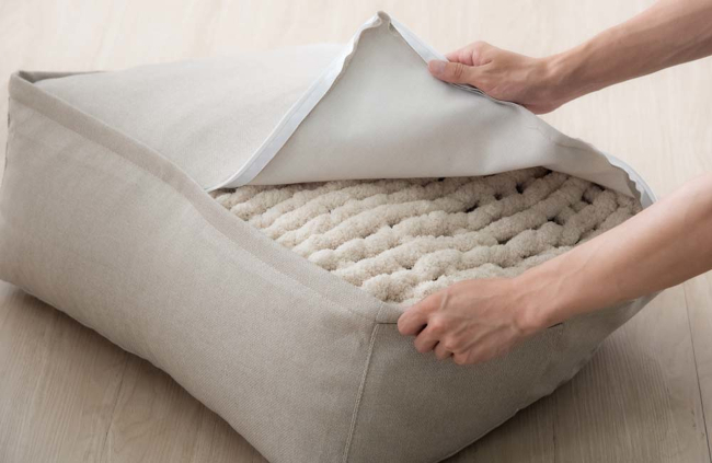 使用しないときは付属のケースに収納が可能で、「moket」を収納したケースはクッションとして使える。ケースの色は「moket」の色に合わせており、部屋に自然に溶け込むデザインになっている。