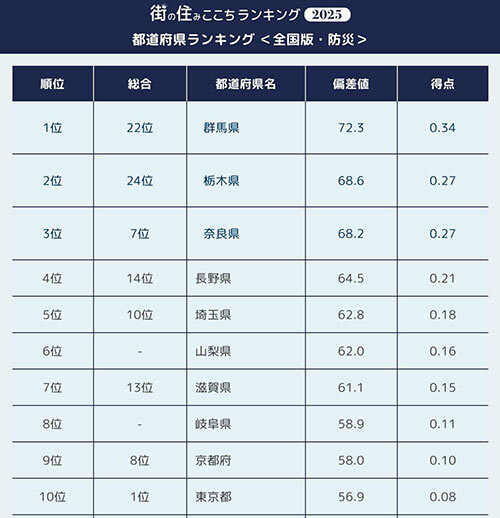 いずれも海に面していない「海なし県」となり、内陸に位置するため津波の心配はありません。「海あり県」に限ると、9位の京都府がトップで、10位には東京都が続きました。自然災害は地震・津波以外にもあるので、拠点性の高い府県が上位に入ったようです。なお、東京都は、総合ランキングでは1位を獲得しています。