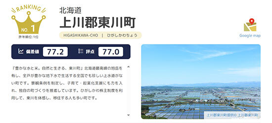 街の住みここち(自治体)ランキング1位は2年連続で北海道上川郡東川町