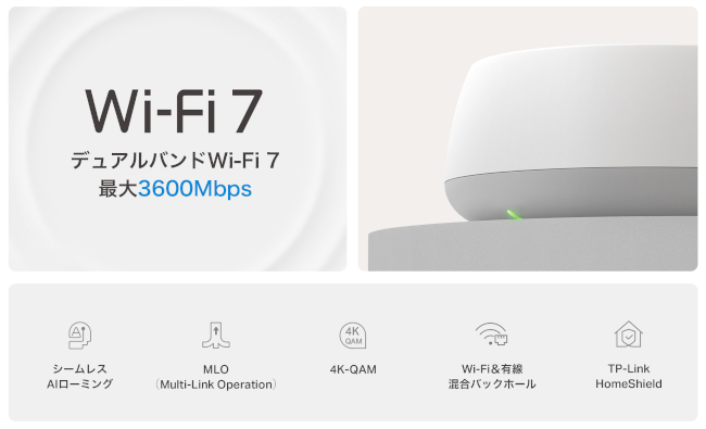 ユニット間の通信では、有線LANと無線LANを同時に利用できるバックホール構成に対応するとともに、無線ではWi-Fi 7のMLO技術によって、スループットの向上・遅延の低減・安定性の強化を実現している。