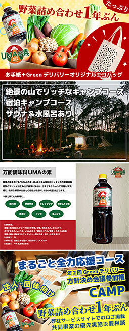 同クラウドファンディングでは、支援に対するリターン(返礼品)として、野菜1年分やキャンプ・バーベキューが楽しめるアウトドアプラン、野菜と相性抜群の「超万能調味料 UMAの素」が入っている数量限定のプランなどを用意している。