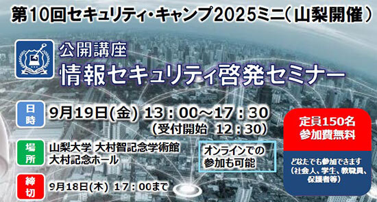 セキュリティ・キャンプ協議会は、「第10回セキュリティ・ミニキャンプ 2025ミニ(山梨開催) 公開講座」を9月19日13時から実施する。会場は、山梨大学大村智記念学術館大村記念ホール。参加費は無料で、だれでも参加できる。定員は150名。オンラインでの参加も可能だ。専用応募フォーム「セキュリティ・キャンプ2025ミニ(山梨開催)公開講座 申込フォーム」で参加申し込みを受け付ける。締め切りは9月18日17時。