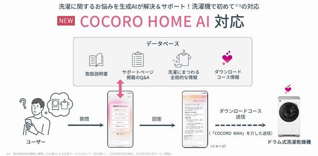 今回の新製品は、同社が培ってきたAIoT技術・データと生成AIを組み合わせた新サービスの「COCORO HOME AI」に対応。このCOCORO HOME AIは洗濯に関する悩みごとをスマートフォンで質問すると、対話形式でAIが解決策を提案してくれるもので、洗濯機で生成AIサービスの導入は業界初という。