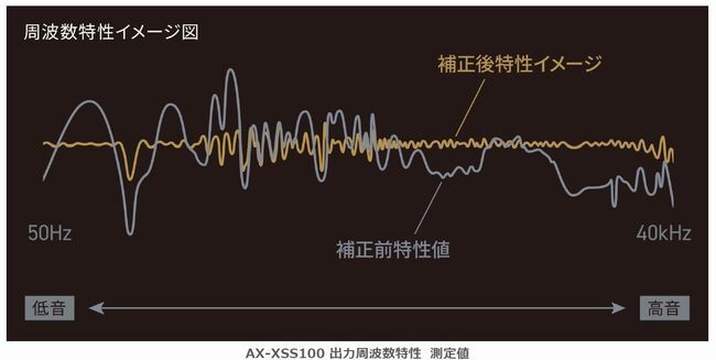 AUREXサウンドプロセッサーのもう一つの技術は、フラット・レスポンス・オプティマイザー。音源を再生するスピーカーは入力された信号の周波数によって、出力が変化する周波数特性がある。フラット・レスポンス・オプティマイザーは、周波数による出力の変化を補正して極力フラットにする技術である。