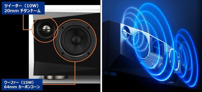 XSS100は、64mm径で15Wのカーボンコーンウーファーと20mm径で10Wのチタンドーム型ツイーターからなる2Wayスピーカーを採用している。2Wayの組み合わせでは、さらに大きな口径のウーファーも試したが、採用した2タイプがベストマッチングだったと同社では説明する。