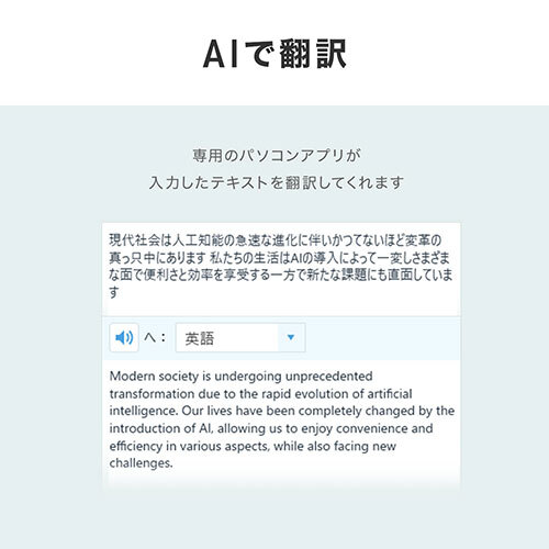 AIによる文章作成支援は、ChatGPTと独自のAIを使用。校正・要約・翻訳・メール作成・記事作成の補助を行う。