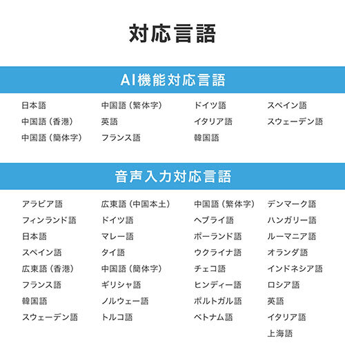 なお、AI機能対応言語は、日本語、中国語(香港)、中国語(簡体字)、中国語(繁体字)、英語、フランス語、ドイツ語、イタリア語、韓国語、スペイン語、スウェーデン語。