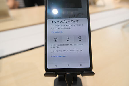 また、「Immersive Audio」機能も注目だ。ヘッドトラッキングセンサーを搭載することで、立体的な音の広がりを感じられるモードで、実際に使用してみると、目の前から音が聞こえるような臨場感が加わる。「静止」の場合は、頭を横に振っても、音の聴こえてくる方向が体の正面に固定され、「移動」の場合は、頭がどの角度でも前方から音が聞こえてくる。
