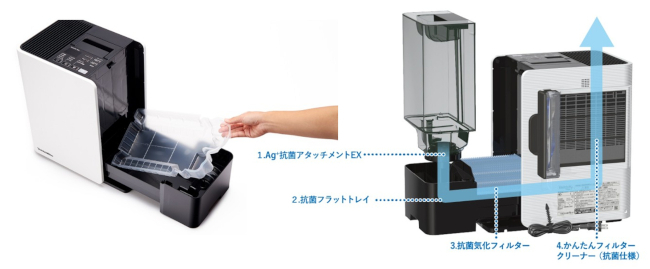 同社の加湿器はすべてハイブリッド式である。加湿器は気化式やスチーム式、超音波式などの方式があるが、同社が採用しているのは気化式と温風気化式を組み合わせたものだ。
