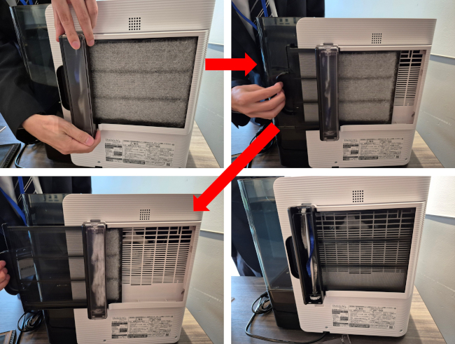 抗菌エアフィルターの左側にはダストケースが配置され、抗菌エアフィルターの取っ手を持ってダストケースを通過させるようにして2~3回左右に動かす。するとフィルターに付着したホコリがダストケース内の回転ブラシで掻き取られる。