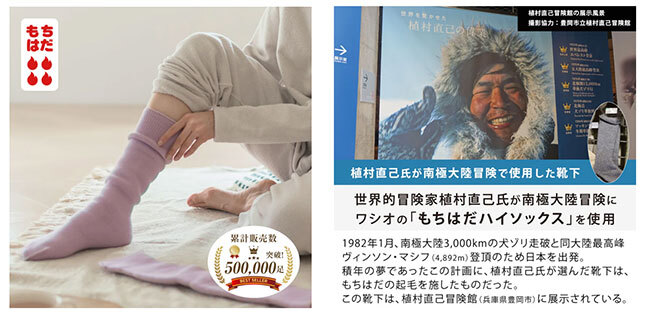 もちはだ ハイソックスを販売するワシオは、1955年創業の防寒衣料メーカーです。同社を代表するのが、70年に誕生した「もちはだ」ブランド。その中で、もちはだ ハイソックスは累計50万足以上を売り上げているロングセラー商品となっています。特許製法の「鷲尾式起毛」で編まれた生地の保温力は唯一無二と評判で、冒険家の植村直己氏が南極大陸横断の際に愛用していたようです。