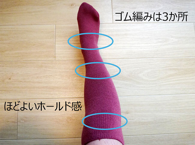 実際に履く前に気になっていたのは、円筒形状だと履いているうちに靴下の位置がずれてしまうのではないかということでした。ただ、そのあたりはフォローされていて、ひざ付近・ふくらはぎ付近、かかと付近の3カ所でゴム編みされており、長く履いていてもズレによる不快感はまったくありませんでした。