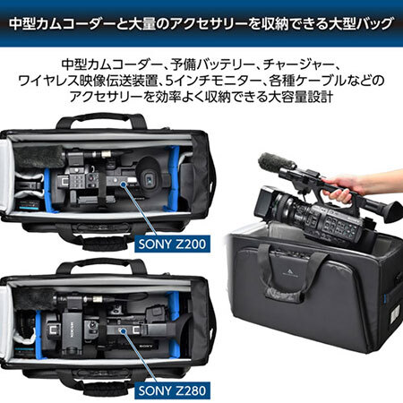 機材を一覧しやすく、すばやくスムーズにカメラを出し入れできる大きな開口部を備えるとともに、水に強い生地素材と止水ファスナーを採用することで、急な天候変化に見舞われる屋外ロケでも安心して持ち運べる(水の浸入を完全には防げない)。