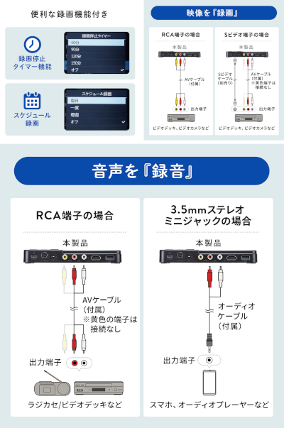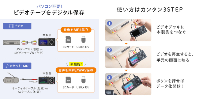 あわせて、映像だけでなく音声データのみの録音にも対応しており、カセットテープやオーディオ機器の音声をMP3やWAV形式で保存できる。