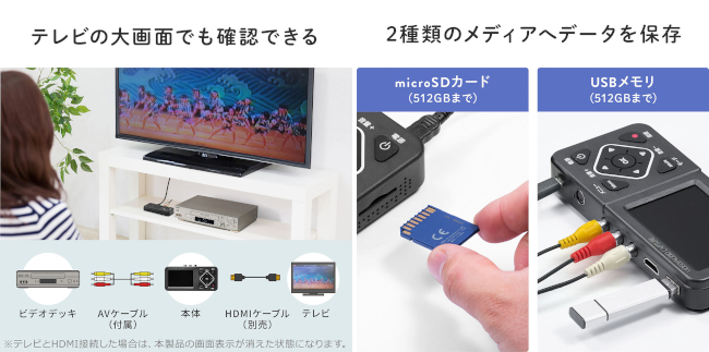 そのほか、本体にはHDMI出力を搭載し、テレビやディスプレーと接続すれば、キャプチャーしたデータを大画面で確認できる。また、microSDカードやUSBメモリーへのデータ保存にも対応する。