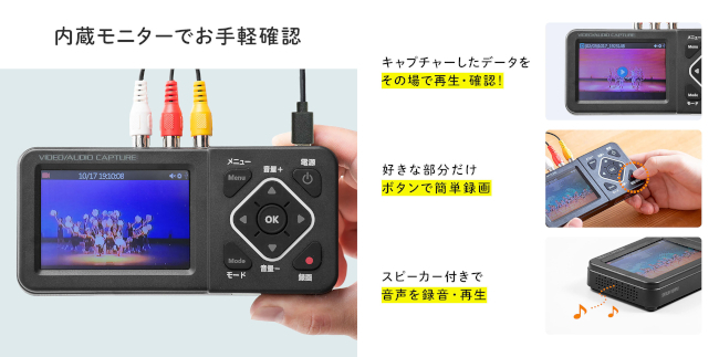 液晶モニタでは、キャプチャーしたデータをその場で確認可能なので、「ちゃんと録れているか不安」という心配がなく、スピーカーも備えているので音声も確かめられる。