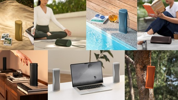 Muoは外出先でも高音質のサウンドを楽しめるポータブルスピーカー。ドライバーユニットには、専用開発のレーストラックドライバーを採用。低音をゆがみなく、低消費電力で再生できるのが特徴だ。