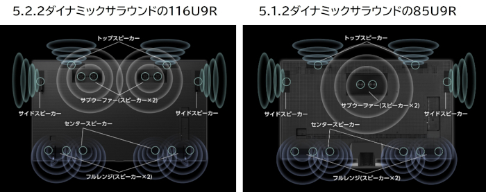 既存のU9Rシリーズと異なるのは内蔵スピーカー。最大出力は110Wで、トップスピーカー×2、サイドスピーカー×2、下部のセンタースピーカーと2つのフルレンジスピーカー×2という構成は既存のモデルと同じだが、116U9Rは2つのスピーカーからなるサブウーファーが2基搭載されている。これが85・75U9Rでは1基である。