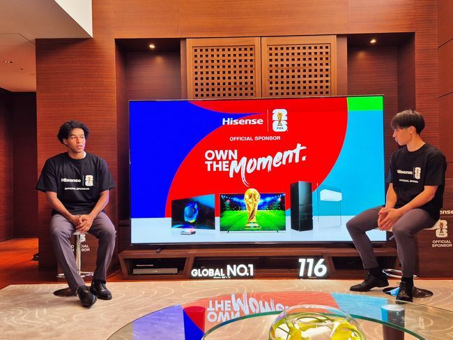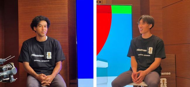 116V型を眼の前にしたジャーメイン選手は「このサイズでありながら画像がキレイ。自宅にハイセンスの85V型がありますが、それ以上に迫力があって圧倒されます」と話し、116U9Rを間近で見た大迫選手も「スゴくキレイというのが一番の印象で、音も良くて臨場感がありますね」と述べた。
