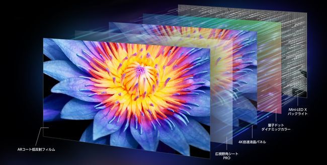 いくつかの技術を紹介しよう。ダイナミックXディスプレイのバックライトにはMini-LED X チップを採用し、拡散する光をレンズで前方向に集めて光漏れを低減。バックライトからの光は量子ドットダイナミックカラーでリアルに近い色に変換されて液晶パネルに映し出される。