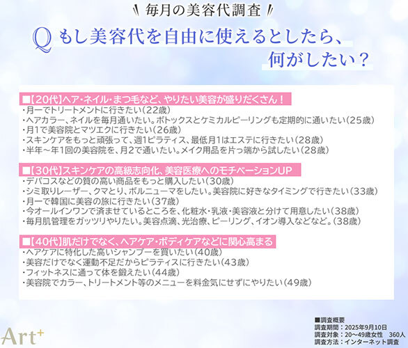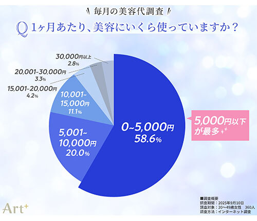 トレンダーズは9月25日に、同社の運営する「理想に出会える」美容医療の専門メディア「Art+(アートプラス)」が、20~40代の女性を対象に実施した「毎月の美容代」に関する調査の結果を発表した。同調査は、9月10日に行われ、360名から有効回答を得ている。
