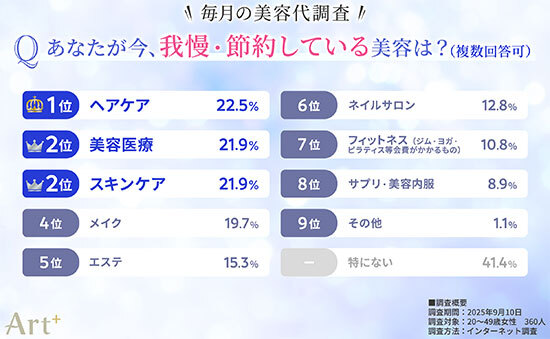 今、我慢・節約している美容を尋ねたところ(複数回答)、「ヘアケア」(22.5%)がもっとも多く、「美容医療」と「スキンケア」(どちらも21.9%)、「メイク」(19.7%)、「エステ」(15.3%)、「ネイルサロン」(12.8%)、「フィットネス」(10.8%)がそれに続いた。