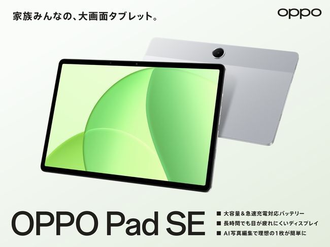 OPPOは9月25日、タブレット新製品「OPPO Pad SE」をOPPO公式オンラインショップなどで発売した。カラーはシルバーで、価格は2万5800円。スタンド機能付きの専用ケースも同時発売し、10月31日までに本体を購入するとケースが付属するキャンペーンも実施中だ。