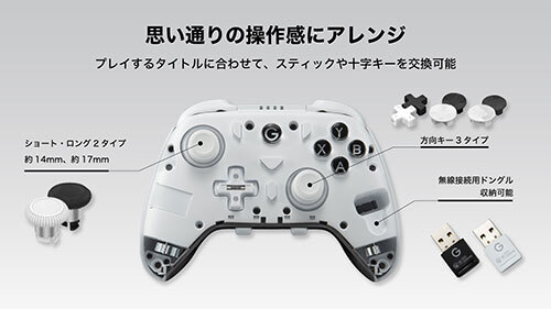 クイックカスタマイズの機能として、ショート約14mm、ロング約17mmのジョイスティック、ディスク、ハイブリッド、クロスの方向キーパーツ3種類が付属。好みに応じてパーツを付け替えられる。