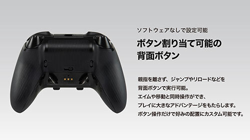 自由にボタン操作を割り当てられる背面ボタンは、アナログスティックや正面ボタンから親指を離すことなく押すことができる。ソフトウェア不要でボタン設定ができるので手軽だ。
