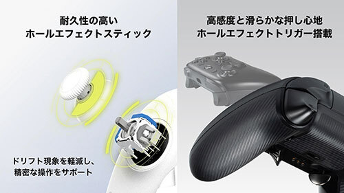 スティックやLT/RTトリガーには、磁石とホールセンサーを組み合わせ、非接触で動きを検出する「ホールエフェクト」を採用した。非接触のため、物理的摩耗がなく、経年劣化の影響も受けにくい。また、微細にスティックの動きも検出し、入力精度も高く、繊細な操作が求められるジャンルでも効果を発揮する。なお、LT/RTトリガーは、ゲームタイトルに応じ、ストロークの深さを調整できる。