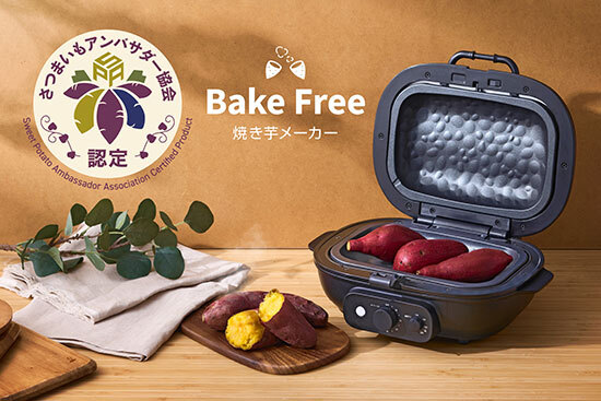 「焼き芋メーカー Bake Free」は、専門店やイベントで食べるあの「焼き芋」の味を「おうちで再現したい」、「おいしい焼き芋をもっと手軽に食べたい」という人のために開発された製品。「Bake Free」という商品名は、自宅で芋を焼く際の手間(余熱する、アルミホイルで包むなど)をなくし、芋を入れるだけの簡単な手順で調理ができるという意味がある。2017年から販売を開始し、累計出荷台数は10万台を超え、「単機能型ホットプレート」としては異例の大ヒット&ロングランを記録している。今回リニューアルにあたっては、さつまいもアンバサダー協会と協力し、初心者から上級者まで、誰でも簡単に焼き芋を美味しく楽しめるような調理家電を目指した。