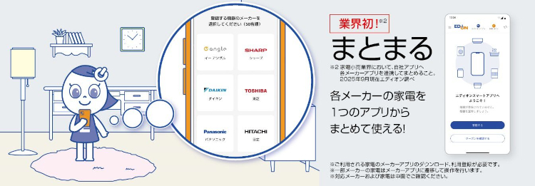 「エディオンスマートアプリ」は、新製品だけでなく、異なる機種・メーカーの家電をまとめて操作することが可能。外出先からエアコンを遠隔操作したり、洗濯機の運転状況を確認したりすることができる。アプリは無料で利用でき、エディオン以外で購入した家電も、まとめて操作することができる。