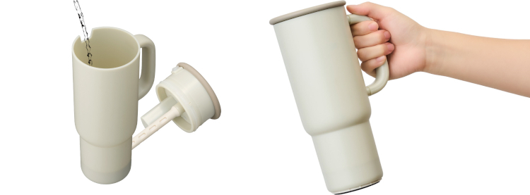 そのほか、取っ手を備えたタンブラー型のデザインを採用することによって、持ち運びやすいほかスムーズに給水できる。また、取っ手によって満水時でも安定して持ち運べる。