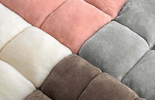 ふんわりと立体的なキルティングが特長のふわもこデザインを採用し、可愛らしくおしゃれな見た目の、ぬくもりを感じさせる仕上がりとなっている。表面にはソフトな質感のマイヤー生地を採用し、肌にしっとりと寄り添うような触り心地を実現した。また、座面には柔らかなPP綿の下に、高密度チップウレタンとピュアウレタンを使用した3層構造を採用し、しっかりとした弾力と包み込まれるような柔らかさを兼ね備えた、快適な座り心地に仕上げている。