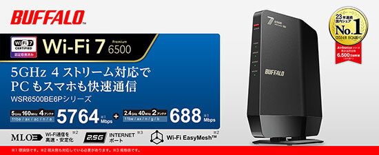 バッファローは、最新無線LAN規格Wi-Fi 7に対応する、プレミアムモデルのデュアルバンド無線LANルーター「WSR6500BE6P」の、ブラックモデルを10月中旬、ホワイトモデルを11月上旬に発売する。価格はオープン。