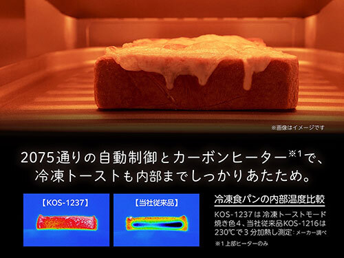 「KOS-1237/W」は、ヒーター制御によって冷凍トーストも表面のみを焼きすぎることなく、ムラなく内部まで熱を伝えることでトースト全体をじっくり温められる、マイコン式のオーブントースター。