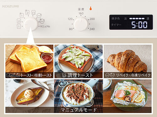 さらに、マニュアルモードに加えて、パンや惣菜の温め直しにも役立つ、7種類のオートメニューも用意しており、オートメニューはトースト(1枚・2~4枚焼き)・冷凍トースト(1枚・2~4枚焼き)、調理トースト、リベイク、冷凍リベイクに対応する。