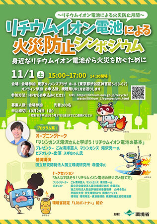 環境省の環境再生・資源循環局 廃棄物適正処理推進課は11月1日15~17時に、11月から始まる「リチウムイオン電池による火災防止月間」に合わせて、「リチウムイオン電池による火災防止シンポジウム」を東京ウィメンズプラザ(東京都渋谷区)のホール、およびオンラインで開催する。参加にあたっては、事前登録が必要となる。