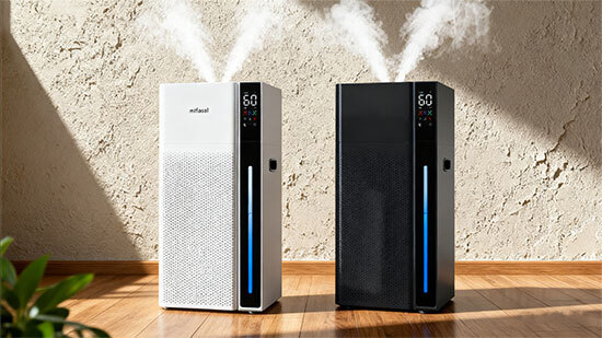 「Mifasolハイブリッド式加湿器」は、20Lの超大容量タンクを搭載することで、一度の給水で最大48時間の長時間連続加湿を可能にした加湿器。加熱式と超音波式を組み合わせたハイブリッド式を採用し、約40℃のミストを吹き出して部屋の温度を下げることなく加湿したい場合や、寒い季節に心地よさを求める際に適した「ヒートミスト」、季節や室温、好みに合わせてミストを自由に切り替えることによって、常に快適な空気環境を提供し、部屋の温度に影響を与えたくない夏場や、リフレッシュしたい時に適した「クールミスト」に対応する。